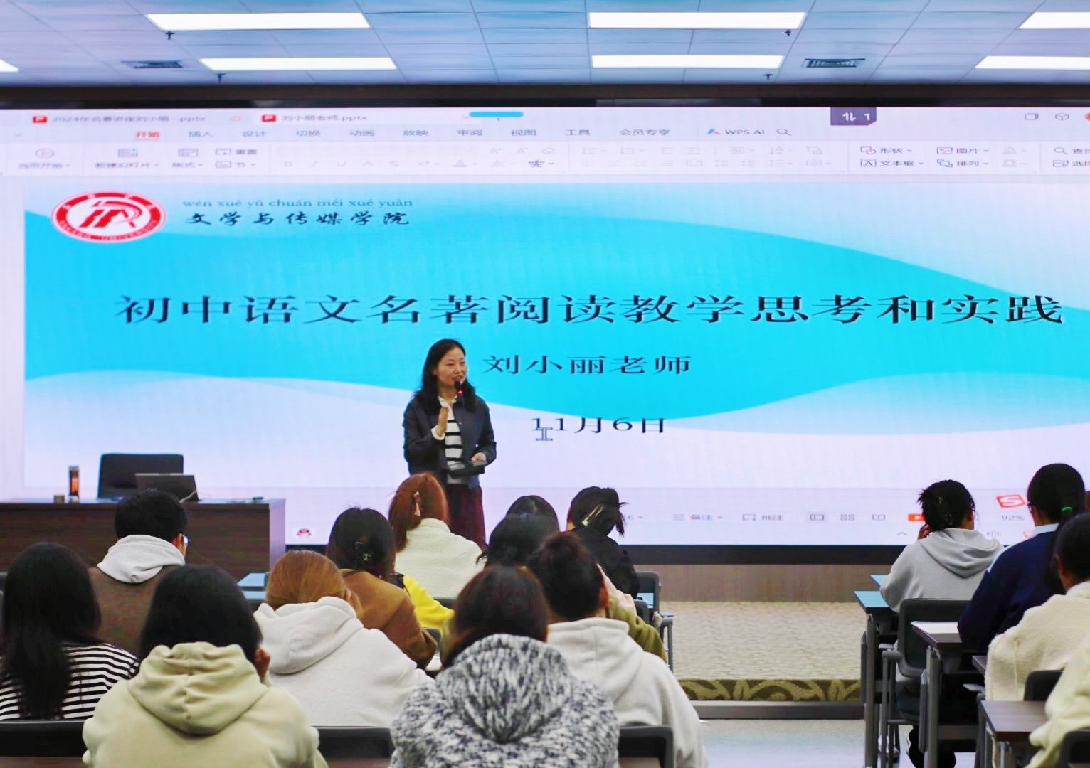 2024年11月6日,文传学院第四届“中学语文卓越师资班”第二场学术活动成功举行,本次讲座特邀陕西省语文教学名师刘小丽开展了以“初中语文名著阅读教学思考和实践”的专题讲座活动,班主任唐明珍和师资班全体学生聆听了本场讲座。