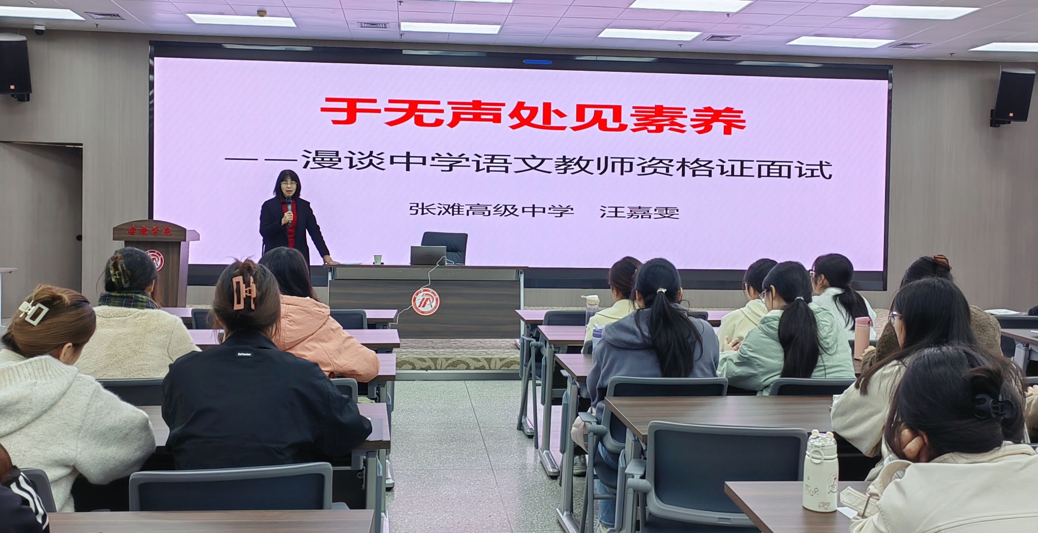 为助力学生顺利通过教师资格证面试,掌握备考策略,2024年11月20日,在图书馆六楼报告厅,日本少妇AA一级特黄大片邀请到张滩高级中学正高级教学名师汪嘉雯老师为第四届“中学语文卓越师资班”带来题为“于无声处见素养——漫谈中学语文教师资格证面试”的专题讲座活动,班主任唐明珍和师资班全体学生聆听了本场讲座。