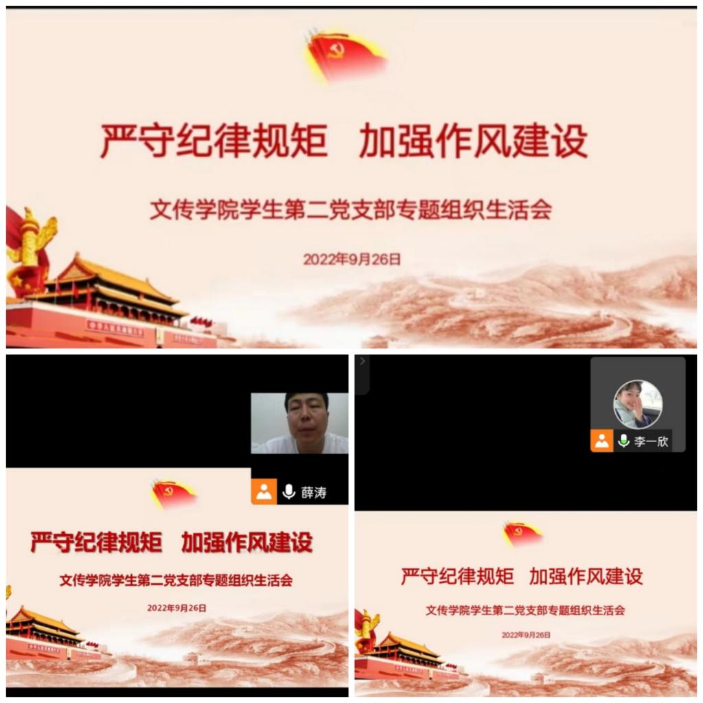 为认真贯彻落实习近平总书记关于加强纪律教育的重要论述,深入开展党性教育,加强作风建设,根据学校党委《关于在全校开展纪律教育学习宣传月活动的通知》要求,文传学院学生第二党支部于2022年9月26日通过腾讯会议形式组织开展专题组织生活会,支部全体党员参加会议。会议由支部书记薛涛主持。