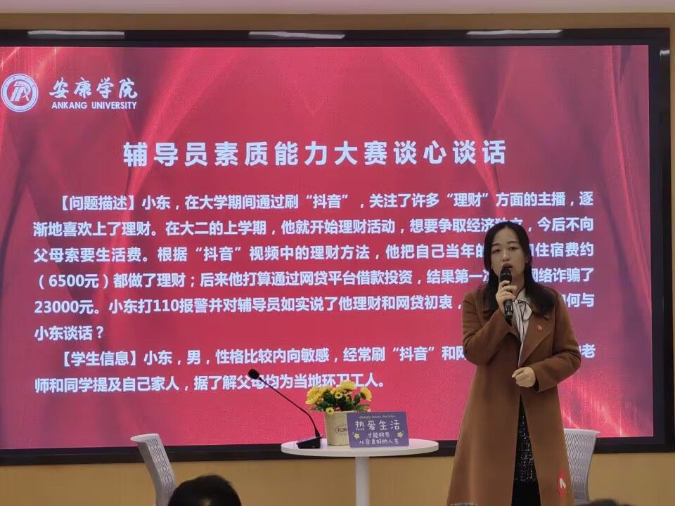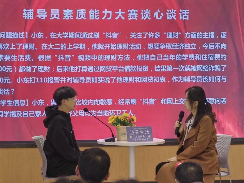 本次大赛分为初赛和决赛两个阶段,初赛采用基础知识测试的形式,从46名辅导员中遴选6名辅导员进入决赛角逐一二等奖。决赛包括案例分析和谈心谈话两个环节,全面考察辅导员对学生特征、成长成才规律的掌握程度及分析问题、研判问题、解决问题、应急处突等能力。参赛辅导员全方位展示了个人素养、知识储备和专业技能,充分彰显了辅导员队伍良好的专业素养和育人风采以及担当实干、追求卓越的精神品质。