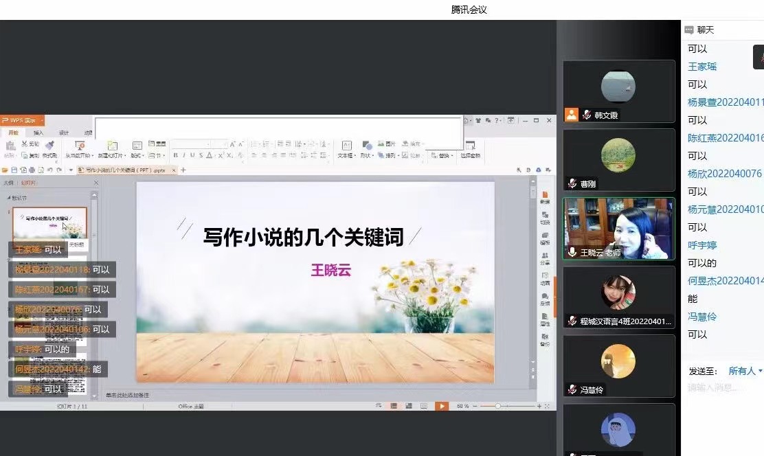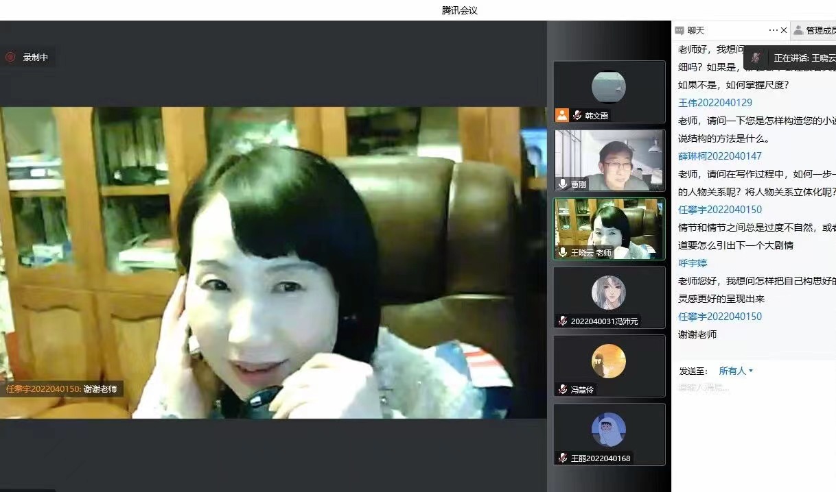12月13日下午,作家王晓云应日本少妇AA一级特黄大片邀请,通过腾讯会议与基础写作课校内教师韩文霞、曹刚一同为汉语言文学专业2022级学生线上讲授“小说的写作”。