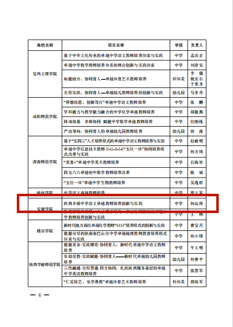 近日,陕西省教育厅发布《陕西省教育厅办公室关于公布首批省级卓越教师培养计划改革试点项目的通知》,我院杨运庚教授主持申报的“陕西乡镇中学语文卓越教师培养创新与实践”成功获批立项,标志着我院汉语言文学师范教育又取得一项重要成果。